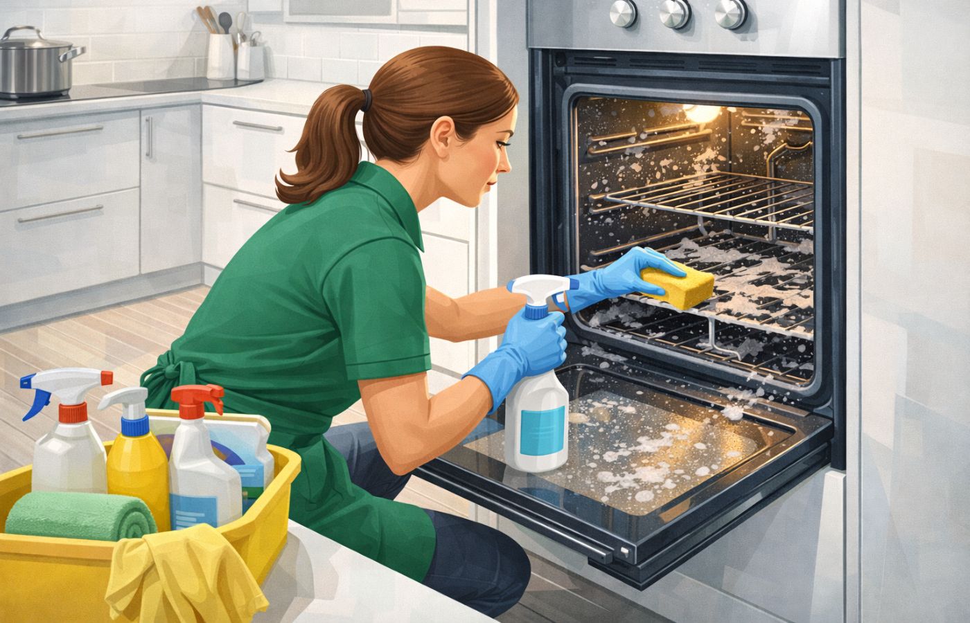 - Clear residue from cabinet handles, edges, and high-contact zones linked to how professionals do clean an oven.